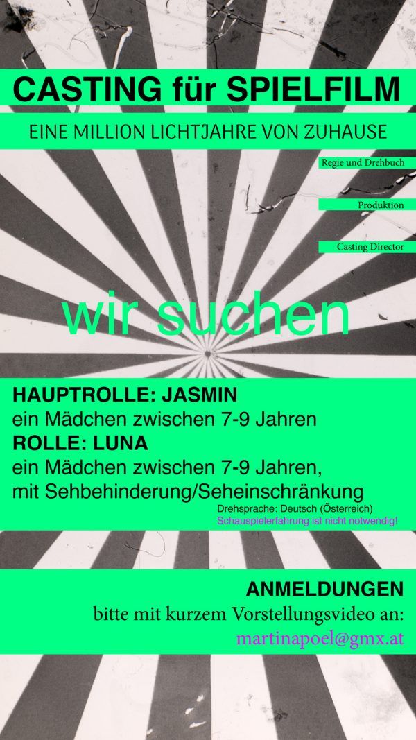 Für zwei Rollen in unserem Spielfilm „EINE MILLION LICHTJAHRE VON ZUHAUSE” suchen wir